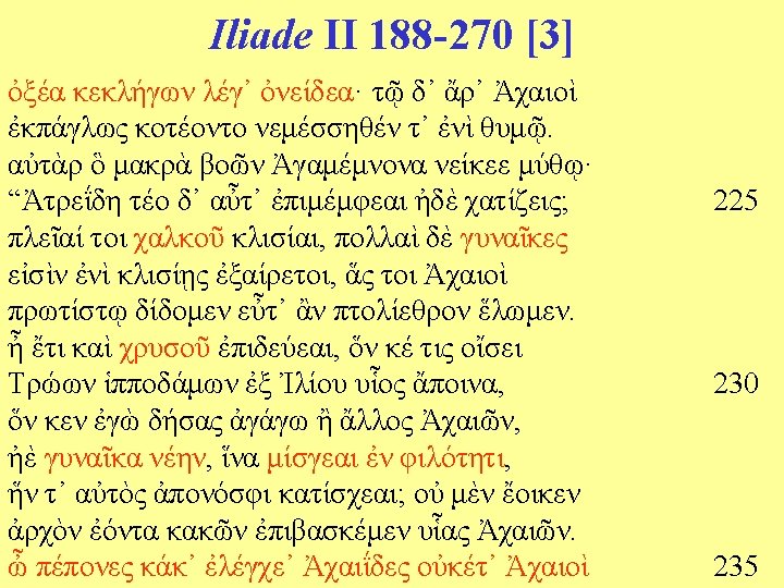 La lingua di Omero? Il fantasma del testo di Omero: prima e dopo Alessandria. L’età prealessandrina: il sostrato acheo (arcadico-cipriota); il sostrato eolico (ma tessalico più che lesbico) e le differenti spiegazioni degli eolismi omerici; la fase ionica; l’edizione pisistratidea e l’atticizzazione (? ); il μεταχαρακτηρισμός ionico del 403 (l’esempio di ΕΟΣ); edizioni κατ’ ἄνδρα e κατὰ πόλιν. L’età alessandrina e postalessandrina: il lavoro degli Alessandrini (Zenodoto, Aristofane di Bisanzio) e le edizioni ‘selvagge’ dei papiri; Aristarco e la sua scuola; l’erudizione ellenistica (Aristonico e Didimo, Erodiano e Nicanore: il commento dei quattro); il Venetus A e la tradizione medioevale. Il problema degli arcaismi: il testo come risultato di un continuo compromesso tra le esigenze della tradizione e della metrica da un lato e della modernizzazione e dell’uditorio dall’altro. La fissazione del testo omerico risale a un’epoca in cui la pronuncia si era già differenziata rispetto a quella degli antichi aedi. Le differenze/oscillazioni (dovute al destinatario: Ioni, Eoli, ecc. ) già nel testo antico.