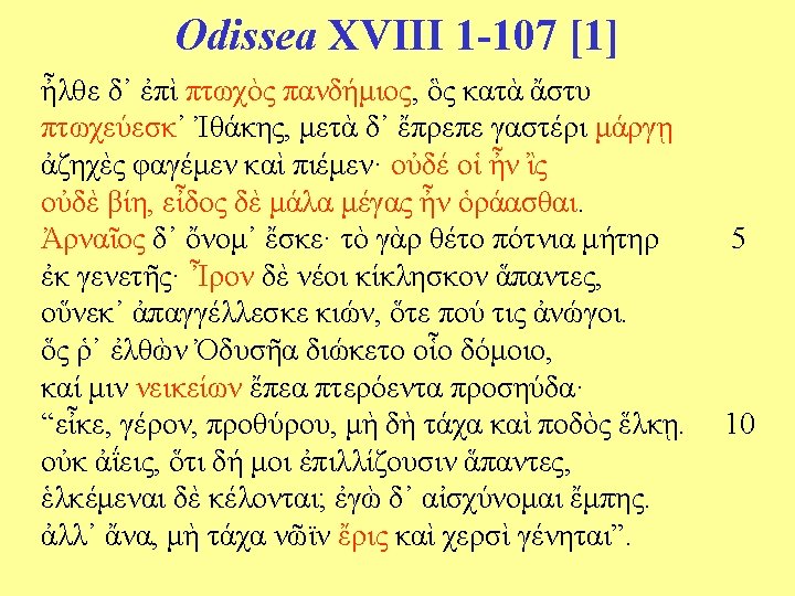 Odisseo e Iro: ironia e spacconeria • nessuno è ciò che sembra· ironia e alazoneia • violenza desiderata e violenza nascosta • dalle parole ai fatti: il disvelamento dell’ἀλαζών • divertimenti miserabili: i proci e la ‘pornografia’ • il terrore della debolezza e la cautela della forza • l’intronizzazione dell’ἀλαζών smascherato • la prova come ristabilimento dei ruoli
