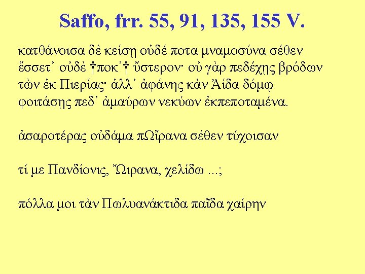 per approfondire. . . • Sapph. fr. 57 V. (la rozzezza di una ciarlatana); • Sapph. fr. 68 a V. (odiata Andromeda, amata Megara); • Sapph. fr. 130 V. (l’ἀλαζονεία di Eros); • Sapph. fr. 133 V. (ancora su Andromeda).