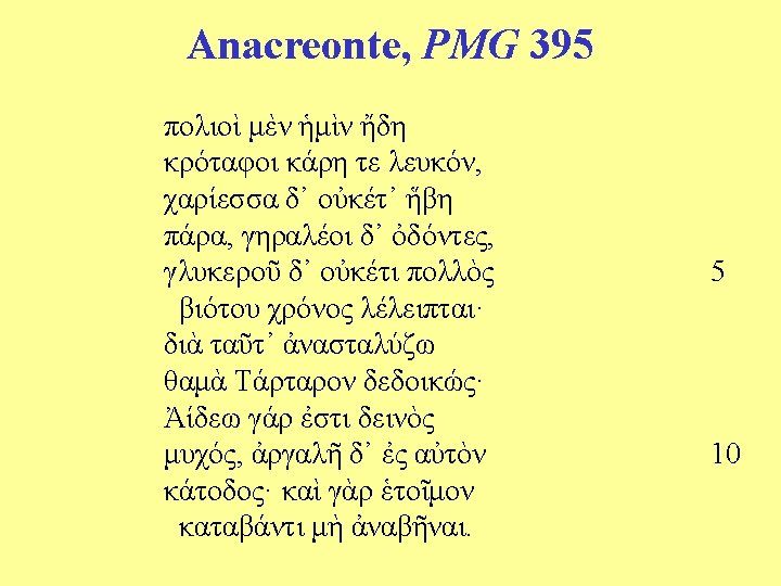 I generi della lirica Il fondo ionico (κότ’, κως, etc. ) e gli epicismi dell’elegia: ionicismi (o atticismi: δορί? ) non epici (la progressiva riduzione) ed epicismi non ionici (il progressivo incremento). L’epigramma dalla dialettizzazione alla maggiore letterarietà (fine IV sec. ). Il verso popolare (con paralleli nel vedico) e lo ionico corrente (cólto, non parlato: la lingua delle iscrizioni) del giambo (forme contratte, crasi, declinazione ‘attica’, termini volgari, la riduzione degli epicismi non ionici). L’incomparabile lirica eolica (in mancanza di una prosa eolica e di una lirica corale epicorica; il limitato apporto delle iscrizioni: fonetica e morfologia, non lessico) e beotica (Corinna), i metri ‘innodici’ indoeuropei, il lessico e lo stile semplici; la lingua delle persone cólte contemporanee (tranne la rarità dell’articolo e delle forme contratte): eolico nei lesbici, ionico in Anacreonte, beotico in Corinna. La lirica corale: il ‘dorico’ di poeti non dorici; composizioni corali per feste religiose pubbliche e successiva laicizzazione; l’ᾱ, gli infiniti in ‑μεν, gen. in ‑ᾶν e dat. in ‑εσσι, la mancanza di aoristi in ‑ξα e di ‘futuri dorici’, la rarità di ϝ (tranne che in Alcmane e in Pindaro: la confusione ϝ/γ nei codici), l’alternanza σύ/τύ, la presenza di ἄν e κε(ν), Μῶσα e Μοῖσα, i gen. in ‑οιο, κῆρ > κέαρ, i composti e la lingua solenne.