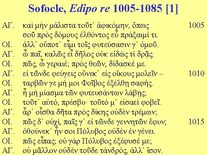 Commistione linguistica nella tragedia I cori: i metri e la lingua lirici, l’ᾱ , le ultime tracce del ‘sacro’ (le oscillazioni testuali e il problema della tradizione linguistica dei testi scenici). Il parlato giambo-trocaico, la lingua di Atene e gli ionismi letterarizzanti: la grammatica attica; α ed η attici; la sporadicità del duale; σσ (non ττ) e ρσ (non ρρ) e gli iperionismi (πυρσός); forme ioniche letterarie (ὄπωπα per ἐόρακα, δούρατος e δορός per δόρατος, Θρῇξ, γῆθεν). La volontà di distaccarsi dall’attico quotidiano e di ‘alzare il tono’: gli omerismi (forme non contratte, lunghe ει e ου per ε e ο, des. in ‑οιο ed ‑εσσι, forme pronominali e articolo-relativo, diverse forme verbali, comp. ἀρείων e βέλτερος, preposizioni, congiunzioni e particelle) e il gioco dei verbi composti (e dei preverbi ‘esaustivi’); la glossa in luogo del nome comune; occidentalismi (nel coro e nel dialogo: dal coro al dialogo o da Corinto ad Atene? Metricismi, poetismi, tecnicismi, ᾱ originari); ionismi non omerici (e. g. κεῖνος, ἱστορέω, φερνή, ἀγρεύω).