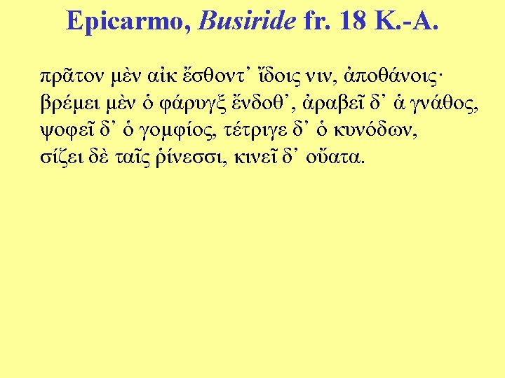 Il ‘dramma’ siciliano e la commedia La misteriosa (l’assenza di opere intere fino a Teocrito e ad Archimede) ma influente (l’esempio delle monete del VI sec. a. C. ) cultura siciliana e le origini doriche del dramma (δρᾶμα) La koine occidentale di tipo dorico: Epicarmo (il nome di un genere? ) e Sofrone (la fortuna). I genitivi ἐμέος e τέος, ϝίσαμι (< ϝίσαντι), δεικνύειν (< δεικνύοντι), πεφύκειν, πέποσχα, il dat. pl. in ‑εσσι, κάρρων (per κρείσσων), ψιν, ψε (per σφιν, σφε) Le differenze dall’attico, la lingua naturale e ‘parlata’, i composti parodici, l’influsso della tragedia.