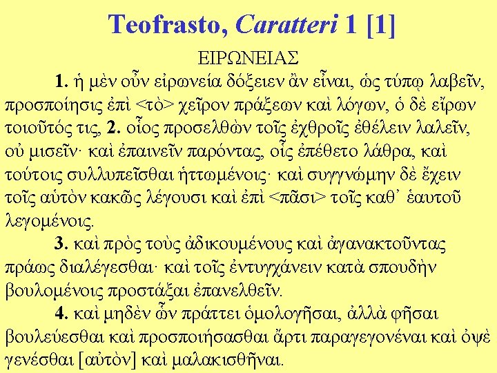 il carattere ironico • i vizi ‘sconvenienti’ • l’etica descrittiva • la mania dell’eironeia • eironea - aletheia - alazoneia • la menzogna per la menzogna • l’arte dell’inganno • i vizi che fanno tenerezza e i vizi che vanno tenuti a bada