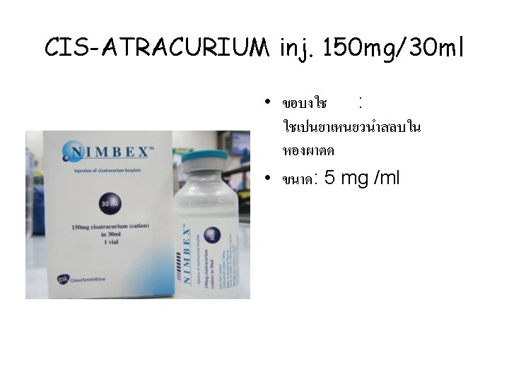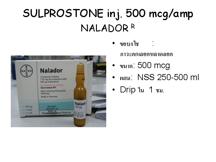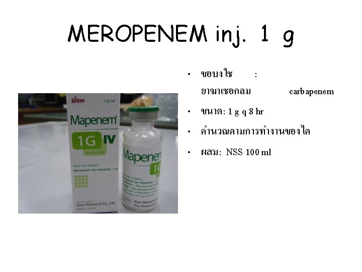 IRONSUCROSE inj 100 mg5 ml iron deficiency anemia Slides: 22 Download presentation IRON-SUCROSE inj. 100 mg/5 ml • ขอบงใช : iron deficiency anemia • ผสมใน NSS 100 ml VANCOMYCIN inj. 500 mg /vial • ขอบงใช : ใชรกษาอาการตดเชอแบคท เรย (methicillin -resistant staph aureus; MRSA ( • ขนาด: 500 mg /vial • ทำละลายดวย sterile water for injection 10 ml • ผสม: NSS , D 5 W 100 ml • Drip > 60 นาท หากใหเรวอาจเกดภาวะ Red man syndrome NAPROXEN TAB 250 MG • NSAIDs