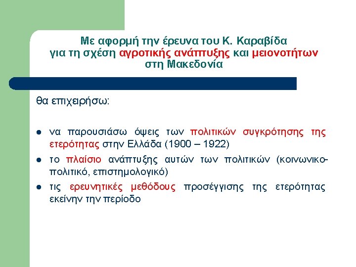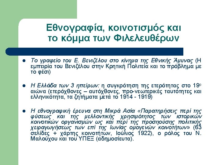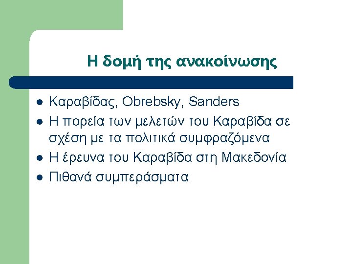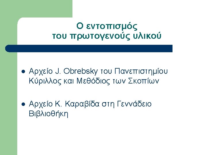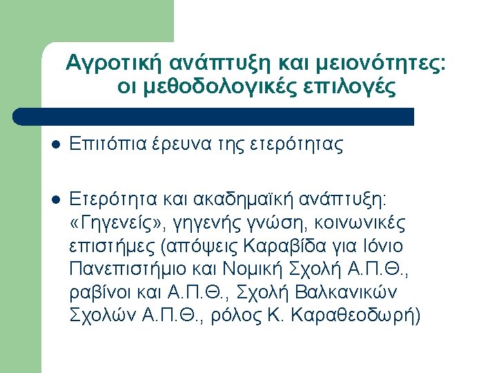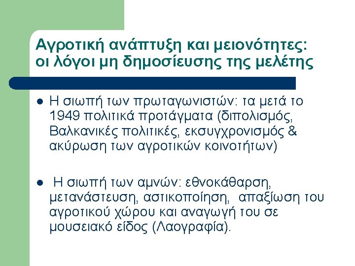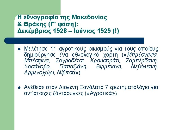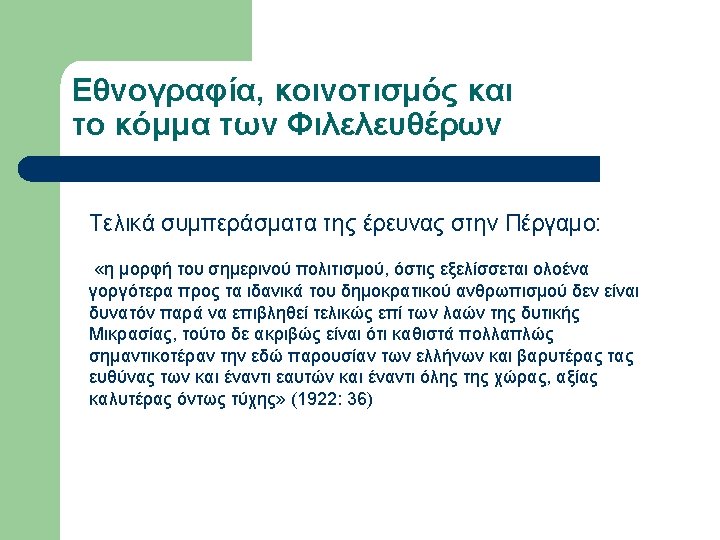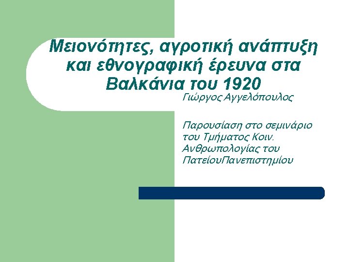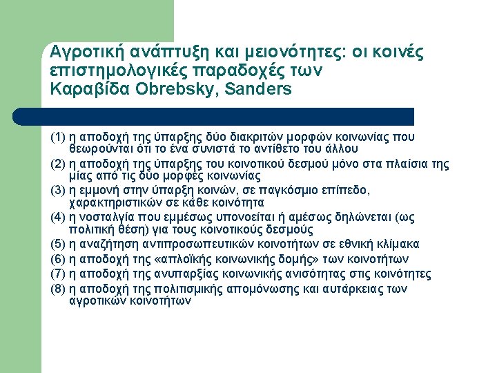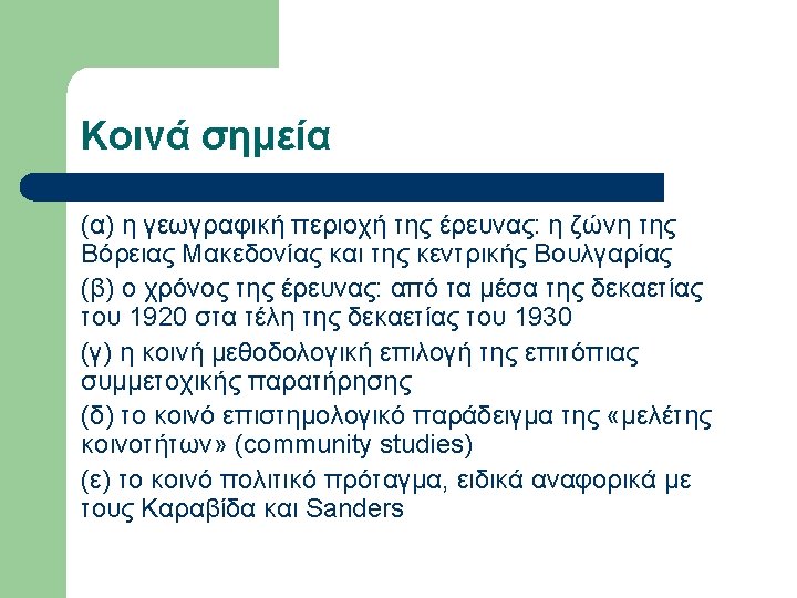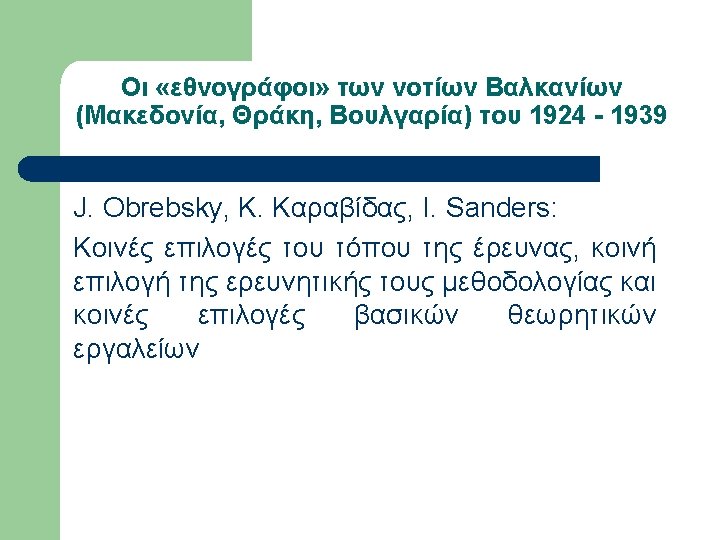 Εργογραφία Sanders (επιλογή) l l l l l 1936, A Bulgarian Village. 1939, May. “Neighborhoods and Neighborly Relations in a Bulgarian Village”, Social Forces, Vol. 17, No. 4, pp. 532 -537. 1939, Oct. “Sociometric work with a Bulgarian woodcutting group”, Sociometry, Vol. 2, No. 4, pp. 58 -68. 1940, Alabama Rural Communities: A study of Chilton County, Alabama College. 1940, Mar. “The School Discovers the Community”, Journal of Educational Sociology, Vol. 13, No. 7, pp. 397 -402. 1940, Oct. “Bulgarians and the Southern Rural Whites in Contrast”, Social Forces, Vol. 19, No. 1, pp. 88 -94. 1943, Aug. “Sociometry and the Sociology Classroom”, Vol. 6, No. 3, pp. 249 -250. 1945, Farmer of the World; the development of agricultural extension, New York, Columbia University Press. 1947, Dec. “Societies around the World”, Journal of Educational Sociology, Vol. 21, No. 4, pp. 238 -242. 1949, Oct. “Societies around the World: A Social Science Course at the University of Kentucky”, Social Forces, Vol. 28, No. 1, pp. 40 -45.