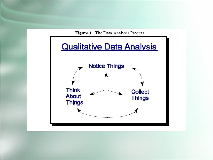 Qualitative Data Analysis by John V. Seidel • Description of how to go about analyzing transcripts of interviews, documents, and/or field notes. • Focus on “coding” – – First identify “events” Assign terms that represent concepts of interest Organizing codes into a scheme Building qualitative models using the coding scheme as the model vocabulary • Focus on iterative nature of QDA