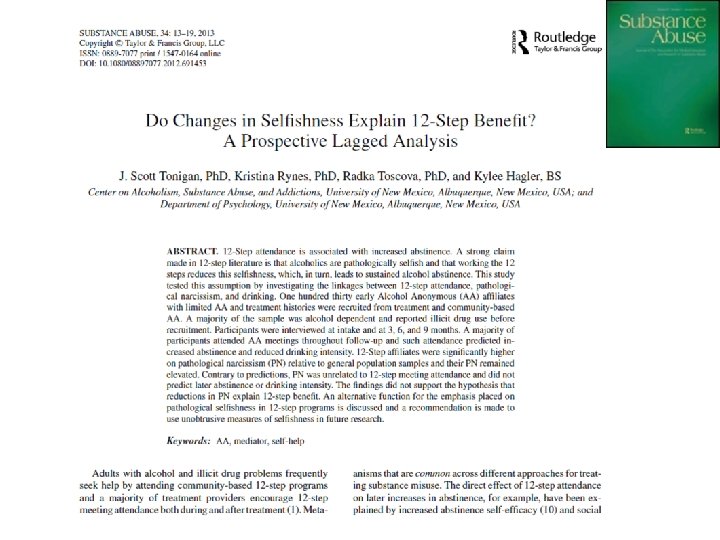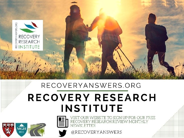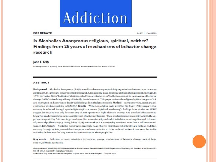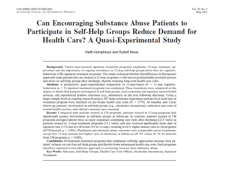 DOES AA “CAUSE” BETTER OUTCOMES OR AA IS PARTICIPATION AN OUTCOME OF BETTER PROGNOSIS? • Using accepted scientific standards (Bradford Hill criteria) and the most rigorous scientific methods (i. e. , RCTs, instrumental variables analysis, PS matching), evidence indicates causal therapeutic benefit of AA • Given AA is available free of charge in most communities and that an intervention’s “Impact” is a product of = reach x effectiveness (Glasgow et al, 2003), AA can be considered a clinical and public health ally in ameliorating the prodigious burden of disease, disability, and premature mortality, attributable to alcohol addiction
