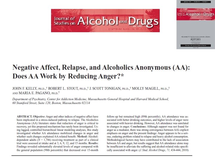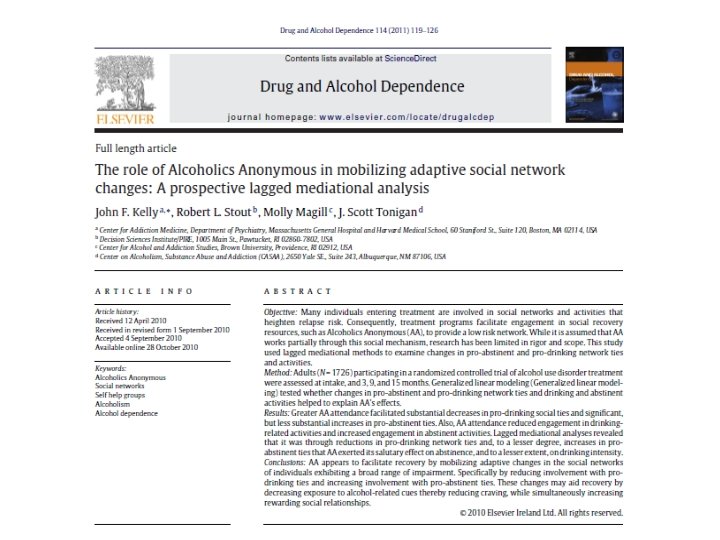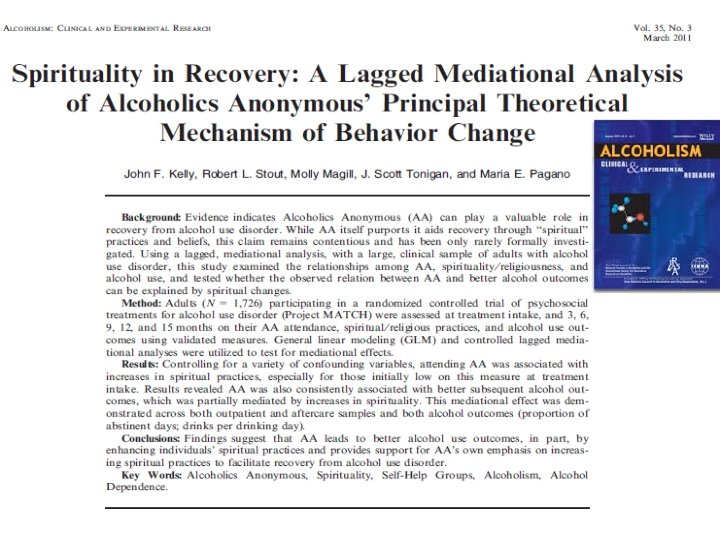 …and lagged moderated multiple mediation studies to elucidate its impact and MOBCs Source: Kelly, Hoeppner, Stout, Pagano (2012) , Determining the relative importance of the mechanisms of behavior change within Alcoholics Anonymous: A multiple mediator analysis. Addiction 107(2): 289 -99