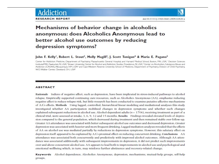 Source: Kelly, Hoeppner, Stout, Pagano (2012) , Determining the relative importance of the mechanisms of behavior change within Alcoholics Anonymous: A multiple mediator analysis. Addiction 107(2): 289 -99