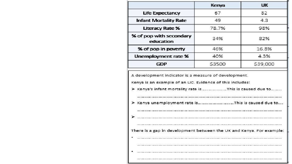 Is Kenya an LIC or HIC? Ø Suggest three reasons why. Is the UK an LIC or HIC? Ø Suggest three reasons why. The chart shows evidence of the development gap. Ø This is…. Ø More specifically…. . Kenya UK Life Expectancy 67 82 Infant Mortality Rate 49 4. 3 Literacy Rate % 78. 7% 98% % of pop with secondary education 34% 82% % of pop in poverty 46% 16. 8% Unemployment rate % 40% 4. 3% GDP $3500 $39, 000