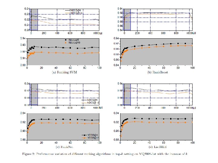 Experimental Setting • Datasets – LETOR 4. 0(MQ 2007 -list, MQ 2008 -list) • Ground-truth: full order • Top-k ground-truth are constructed by just preserving the total order of top k items • Algorithms – Pairwise: Ranking SVM, Rank. Boost, Rank. Net – Listwise: List. MLE • Experiments – Study how the test performances of ranking algorithms change w. r. t. k in the training data of top-k setting.