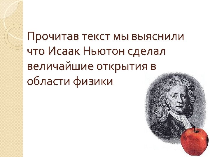 Isaac Newton � � � � Newton, one of the greatest scientists of all times was born in 1642 in the little village in Lincolnshire, England. His father was a farmer and died before Newton was born. His mother was a clever woman whom he always loved. After the school, Newton studied mathematics at Cambridge university and received his degree in 1665. Then the university was closed because of the danger of plague and Newton went home for eighteen months. It was most important period in his life when he made his three great discoveries — the discoveries of the differential calculuses, of the nature of white light, and of the law of gravitation. These discoveries are still important for the modern science. Newton had always been interested in the problems of light. Many people saw colours of a rainbow but only Newton showed, by his experiments, that white light consists of these colours. It is interesting how he discovered the law gravitation. Once, as he sat at the garden, his attention was drawn by the fall of an apple. Many people saw such an usual thing before. But it was Newton who asked himself a question: "Why does that apple fall perpendicularly to the ground? Why doesn't it go sidewards or upwards? " The answer to this question was theory of gravitation, discovered by Newton died at the age of 84, and was buried in Westminster Abbey, where his monument stands today.