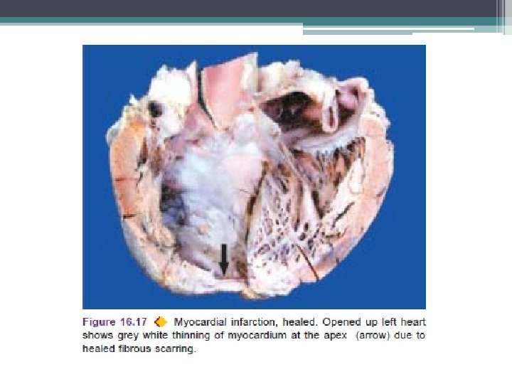 CHRONIC ISCHAEMIC HEART DISEASE • Chronic ischaemic heart disease, ischaemic cardiomyopathy or myocardial fibrosis, are the terms used for focal or diffuse fibrosis in the myocardium characteristically found in elderly patients of progressive IHD. • Such small areas of fibrous scarring are commonly found in the heart of patients who have history of episodes of angina and attacks of MI some years back. • Gradually developing CHF due to decompensation over a period of years. • Occasionally, serious cardiac arrhythmias or infarction may supervene and cause death.