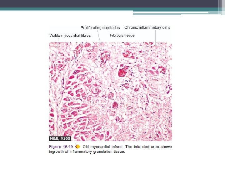 • Risk of ischaemic reperfusion injury. • Further myonecrosis during reperfusion occurs due to rapid influx of calcium ions and generation of toxic oxygen free radicals. • Grossly, the myocardial infarct following reperfusion injury appears haemorrhagic rather than pale. • Microscopically, myofibres show contraction band necrosis which are transverse and thick eosinophilic bands.