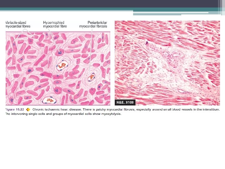 • Microscopically i) There are scattered areas of diffuse myocardial fibrosis, especially around the small blood vessels in the interstitial tissue of the myocardium. ii) Intervening single fibres and groups of myocardial fibres show variation in fibre size and foci of myocytolysis. iii) Areas of brown atrophy of the myocardium may also be present. iv) Coronary arteries show atherosclerotic plaques and may have complicated lesions in the form o superimposed thrombosis.