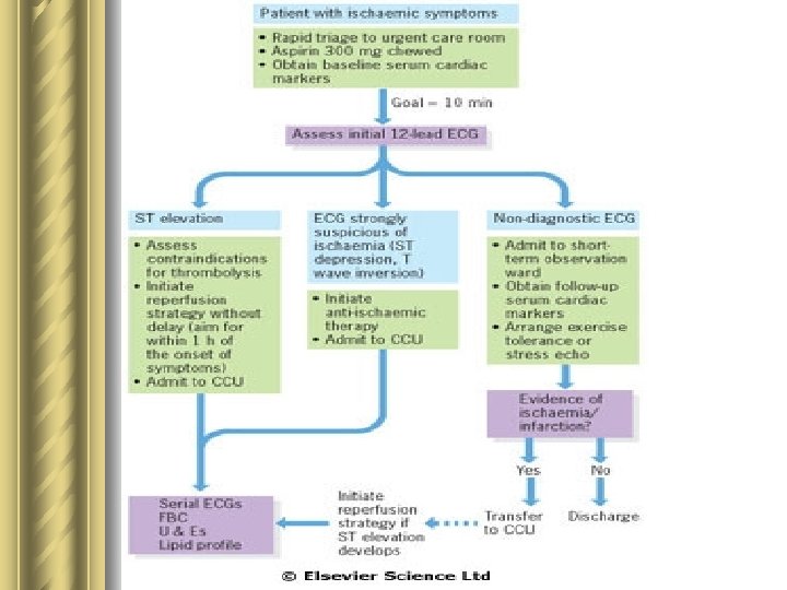 Diagnóza IM l. Diagnóza založena alespoň na dvou příznacích: l. Přítomnost bolesti na hrudníku l. Odpovídající změny EKG l. Vzestup srdečních enzymů nebo troponinů.