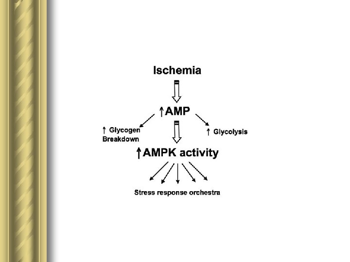 Alterace v produkci energie v myokardu l Během ischémie vede k nerovnováze v produkci a utilizaci ATP. Proto ischémie vede k tvorbě AMP, který signalizuje, že v buňce se rozvíjí metabolický kompromis. l Nárůst koncentrace AMP přímo aktivuje specifické molekuly účastnící se v energetických metabolických cestách (štěpení glykogenu a glykolýza) a AMPK (AMP kináza). l Aktivovaná AMPK reguluje molekulární cesty, které můžeme považovat za odpovídající na stres.