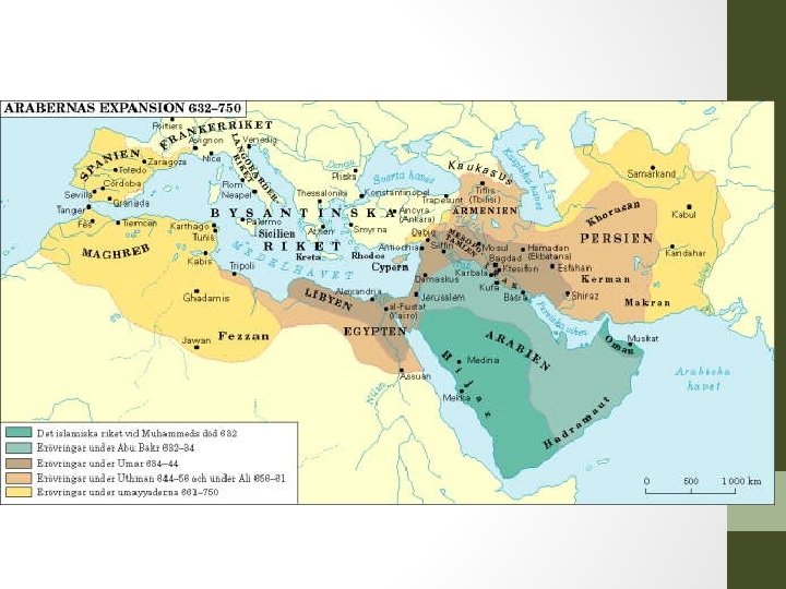 Ursprung - Muhammed • Det muslimska styret utvidgades genom politiska överenskommelser och krigsföring. • Vid sin död år 632 var Muhammed ledare för stora delar av den arabiska halvön. • Expansionen fortsatte även därefter med enorm fart.