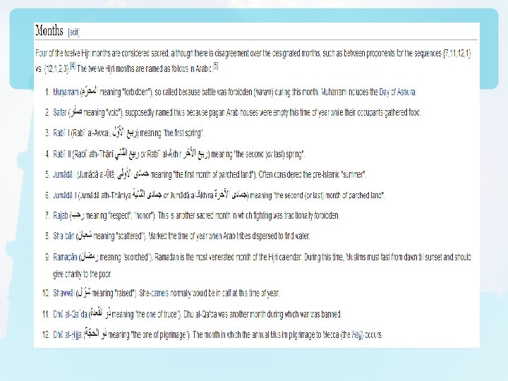 Islamic Calendar § Calendar is lunar § Consists of 12 months of 29 or 30 days each, totalling 354 days § Has no corrective system to align it with the solar calendar so the Islamic holidays to not always fall in the same season, and they occur earlier every year on the solar calendar § Years are numbered from the event of the Hijira (Muhammad’s departure from Mecca to Medina) in 622 CE, and designated AH (after the Hijira) § First day of the Islamic era is Muharram 1, 1 AH or July 16, 622 CE