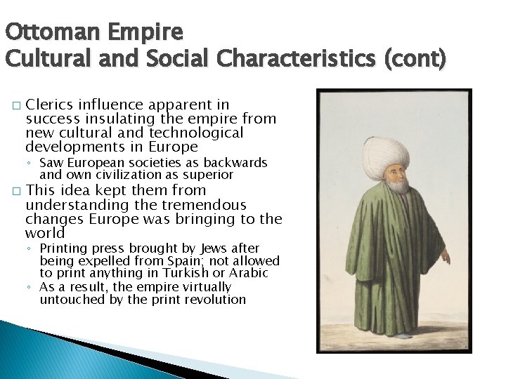 Ottoman Empire Cultural and Social Characteristics (cont) � Clerics influence apparent in success insulating the empire from new cultural and technological developments in Europe ◦ Saw European societies as backwards and own civilization as superior � This idea kept them from understanding the tremendous changes Europe was bringing to the world ◦ Printing press brought by Jews after being expelled from Spain; not allowed to print anything in Turkish or Arabic ◦ As a result, the empire virtually untouched by the print revolution