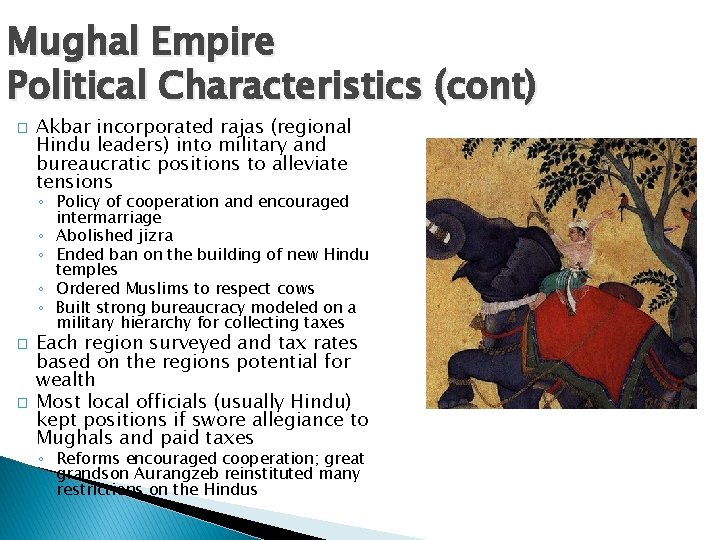 Mughal Empire Political Characteristics (cont) � Akbar incorporated rajas (regional Hindu leaders) into military and bureaucratic positions to alleviate tensions ◦ Policy of cooperation and encouraged intermarriage ◦ Abolished jizra ◦ Ended ban on the building of new Hindu temples ◦ Ordered Muslims to respect cows ◦ Built strong bureaucracy modeled on a military hierarchy for collecting taxes � � Each region surveyed and tax rates based on the regions potential for wealth Most local officials (usually Hindu) kept positions if swore allegiance to Mughals and paid taxes ◦ Reforms encouraged cooperation; great grandson Aurangzeb reinstituted many restrictions on the Hindus