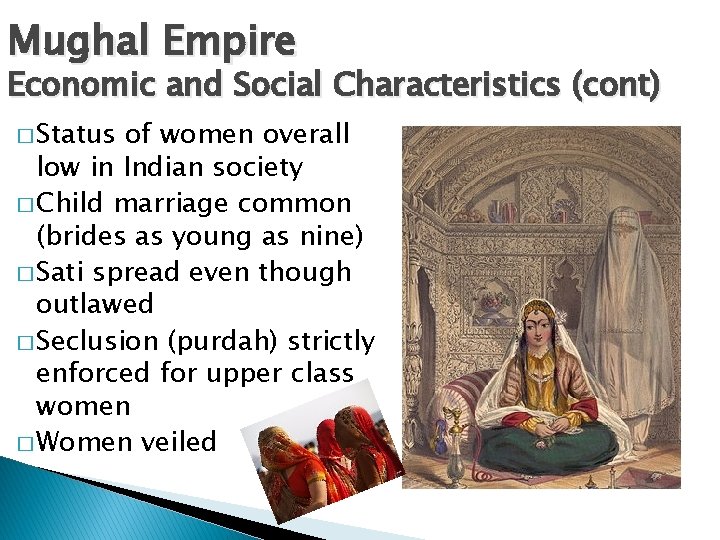 Mughal Empire Economic and Social Characteristics (cont) � Status of women overall low in Indian society � Child marriage common (brides as young as nine) � Sati spread even though outlawed � Seclusion (purdah) strictly enforced for upper class women � Women veiled