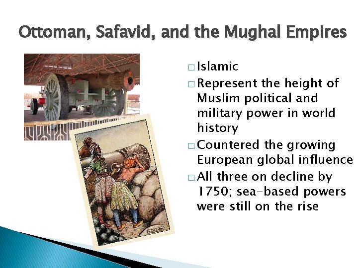 Ottoman, Safavid, and the Mughal Empires � Islamic � Represent the height of Muslim political and military power in world history � Countered the growing European global influence � All three on decline by 1750; sea-based powers were still on the rise
