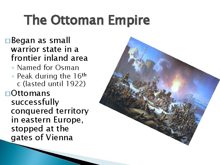 The Ottoman Empire � Began as small warrior state in a frontier inland area ◦ Named for Osman ◦ Peak during the 16 th c (lasted until 1922) � Ottomans successfully conquered territory in eastern Europe, stopped at the gates of Vienna