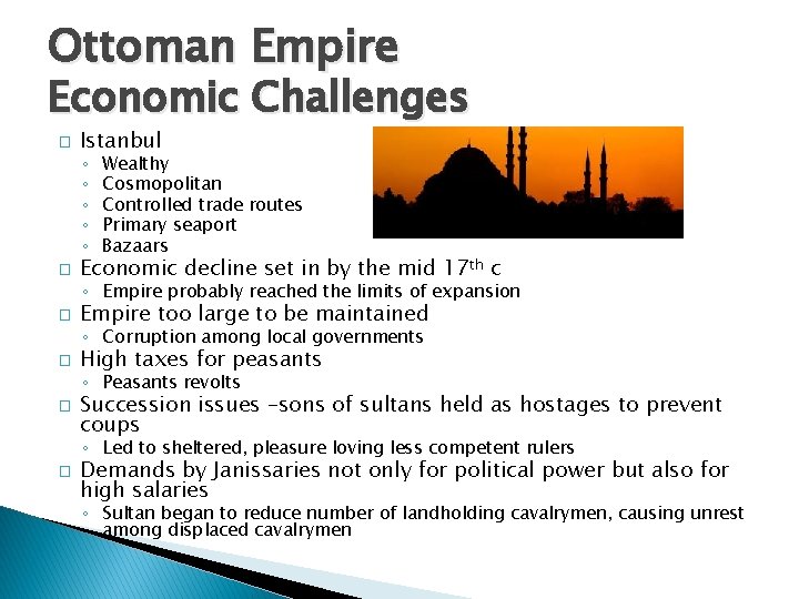 Ottoman Empire Economic Challenges � Istanbul ◦ ◦ ◦ � Wealthy Cosmopolitan Controlled trade routes Primary seaport Bazaars Economic decline set in by the mid 17 th c ◦ Empire probably reached the limits of expansion � Empire too large to be maintained ◦ Corruption among local governments � High taxes for peasants ◦ Peasants revolts � Succession issues –sons of sultans held as hostages to prevent coups ◦ Led to sheltered, pleasure loving less competent rulers � Demands by Janissaries not only for political power but also for high salaries ◦ Sultan began to reduce number of landholding cavalrymen, causing unrest among displaced cavalrymen