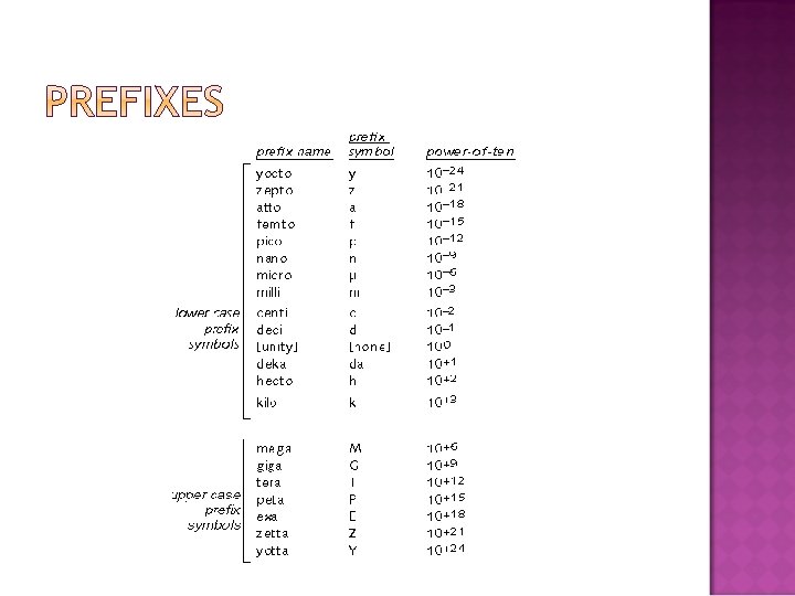 Measured Quantity Units Symbol Length Meter m Mass Kilogram Kg Time Second s Temperature Kelvin K Electrical Current Ampere A Quantity of substance Mole mol Luminosity Candela Cd Plane angle Radian rd