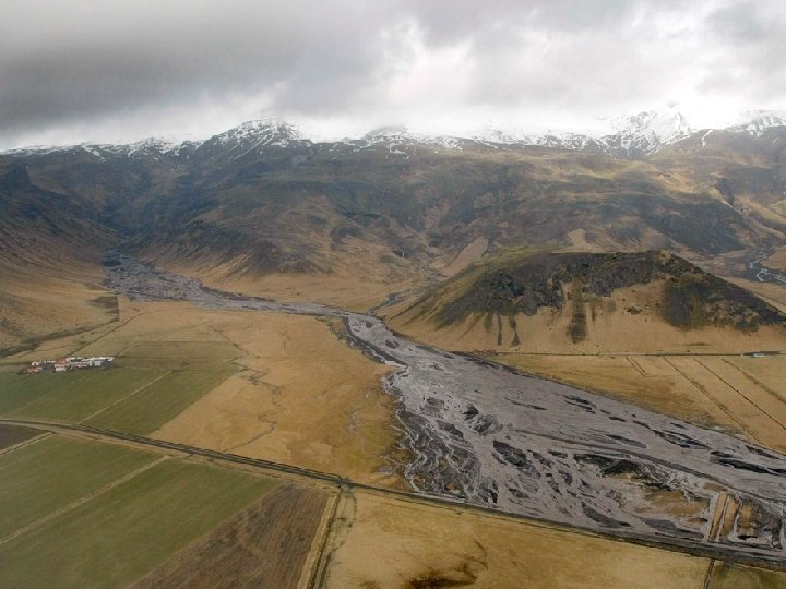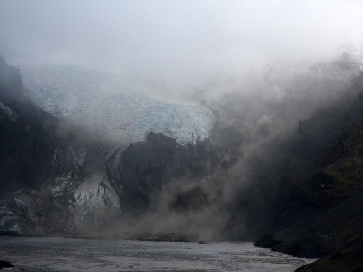 Voda z roztaveného ledovce smíchaná se sopečným popelem se řítí dolů údolím ledovcového splazu. (Porovnej s letícím letadlem)