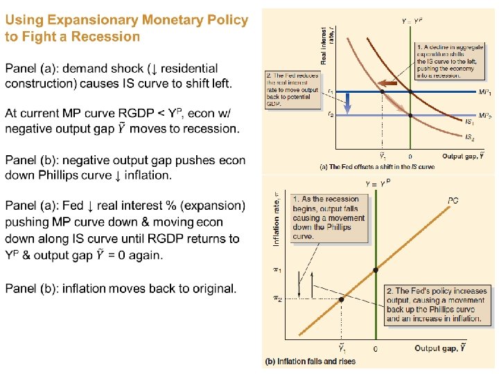 Using Monetary Policy to Fight Inflation Fed Chairman Volcker took office in August 1979 with a mandate to ↓ inflation. To permanently ↓ π Fed needs to ↓ πe by maintaining π < πe. For that according to PC ↓ RGDP < YP. Done by ↑ real interest % after with ↑ MP curve. If inflation persists at π2 households ↓ πe. PC shifts down allowing Fed to ↓ real interest % returning RAGD = YP but at lower inflation.
