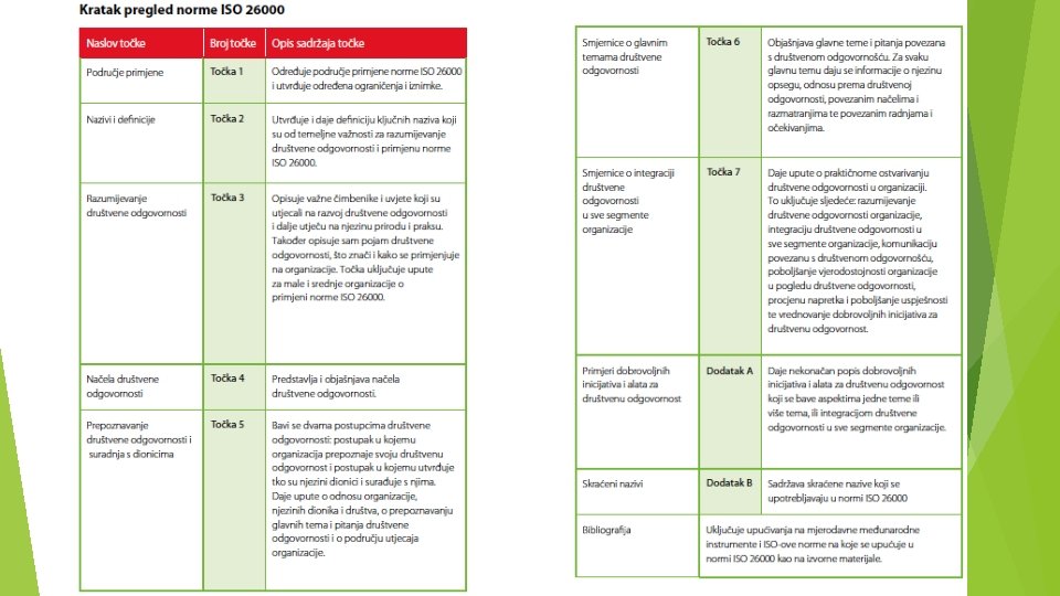 Sadržaj ISO 26000 0 Uvod 1 Područje primjene 2 Upućivanje na druge norme 3 Nazivi i definicije 4 Kontekst društvene odgovornosti u kojemu posluju sve organizacije 5 Načela društvene odgovornosti bitna za organizacije 6 Upustva o ključnim temama/pitanjima društvene odgovornosti 7 Uputstva za organizacije u vezi s uvo�đenjem društvene odgovornosti 8 Dodatci - uputstva Bibliografija