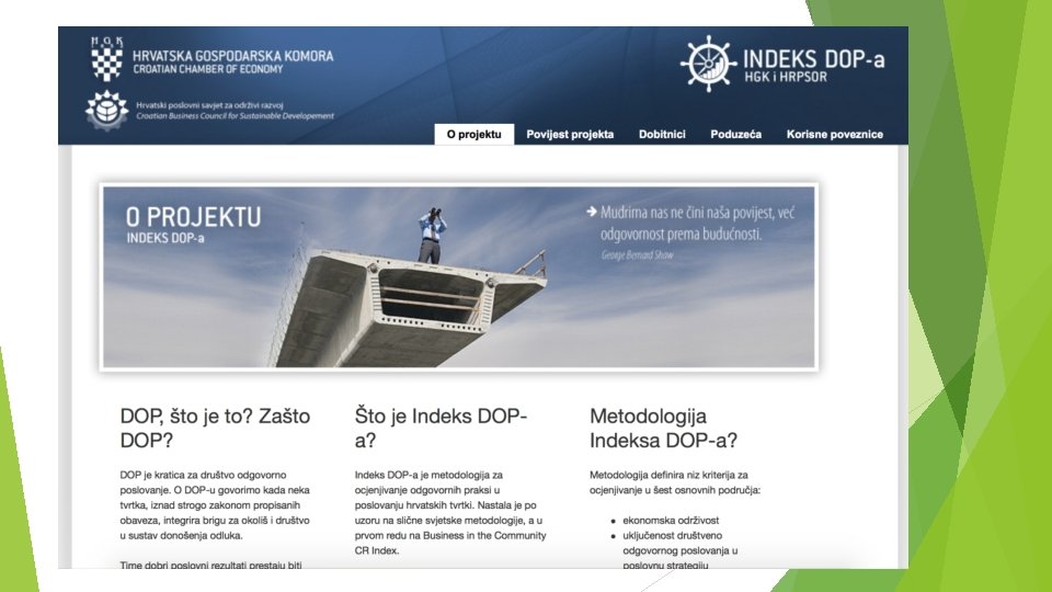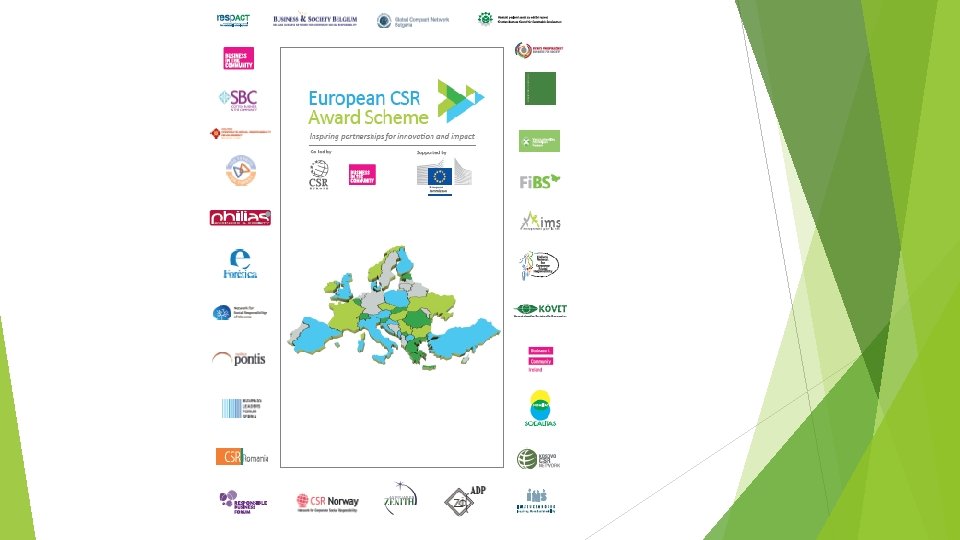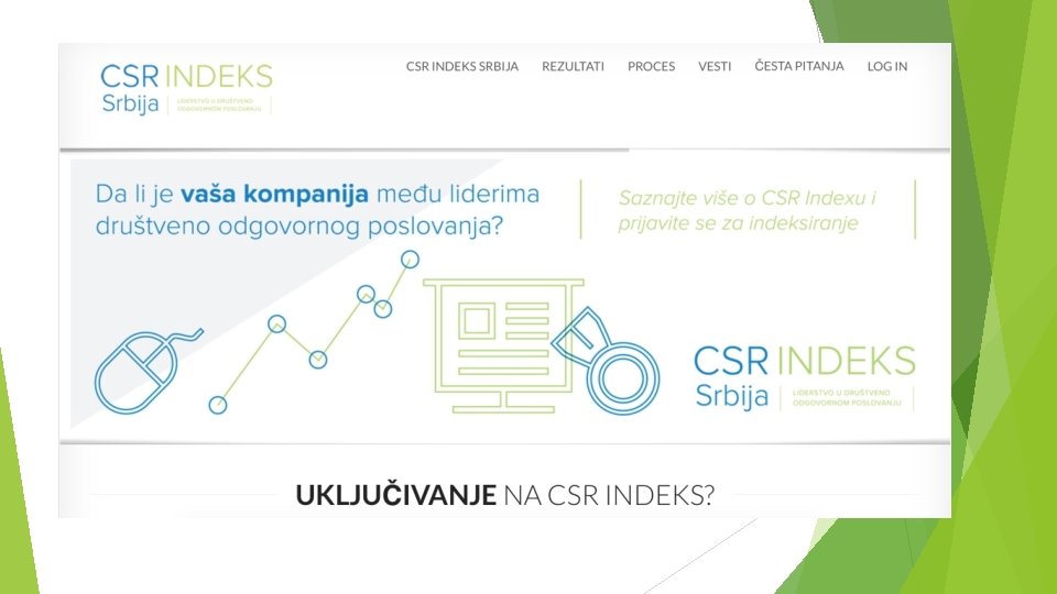 KDO indeksi Dow Jones Sustainability Index series (DJSI) Calvert Social Index (CSI) FTSE 4 GOOD series FTSE Johannesburg Stock Exchange Socially Responsible Index (JSE SRI) Sao Paolo Stock Exchange Corporate Sustainability Index (ISE) KLD Global Sustainability Index Series (GSI) CR Index – Business in community, UK