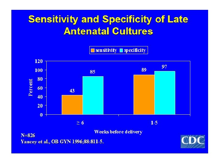 Transmissão materno-fetal - SGB Mãe colonizada 50% RN não colonizado RN colonizado 98% Assintomático 2% Sepse, pneumonia e meningite
