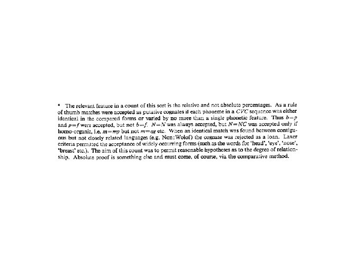 The Swadesh list 1 tout 2 cendre 3 écorce 4 ventre 5 gros 6 oiseau 7 mordre 8 noir 9 sang 10 os 11 sein 12 brûler 13 nuage 14 froid 15 venir 16 mourir 17 chien 18 boire 19 sec 20 oreille 21 manger 22 oeuf 23 oeil 24 graisse 25 plume all ashes bark belly big bird to bite black blood bone breast to burn cloud cold to come to die dog to drink dry ear to eat egg eye fat feather the 40 ASJP notions 26 feu 27 poisson 28 pou 29 voler 30 jambe 31 plein 32 donner 33 aller 34 bon 35 terre 36 cheveu 37 bras 38 tête 39 entendre 40 coeur 41 corne 42 chaud 43 moi 44 tuer 45 genou 46 savoir 47 feuille 48 être couché 49 petit 50 foie fire fish louse to fly foot full to give to go good ground hair hand head to heart horn hot I to kill knee to know leaf to lie little liver 51 long 52 homme 53 beaucoup 54 viande 55 lune 56 colline 57 bouche 58 ongle 59 nom 60 cou 61 nouveau 62 nuit 63 NEG 64 nez 65 un 66 personne 67 pluie 68 rouge 69 chemin 70 racine 71 rond 72 sable 73 dire 74 voir 75 graine long many meat moon mountain mouth nail name neck new night no nose one person rain red road root round sand to say to seed 76 s’asseoir 77 peau 78 dormir 79 fumée 80 être debout 81 étoile 82 pierre 83 soleil 84 nager 85 queue 86 cela 87 ceci 88 langue 89 dent 90 arbre 91 deux 92 marcher 93 eau 94 nous 95 quoi ? 96 blanc 97 qui ? 98 femme 99 toi 100 vous to sit skin to sleep smoke to stand star stone sun to swim tail that this tongue tooth tree two to walk water we what white who woman you sg you pl