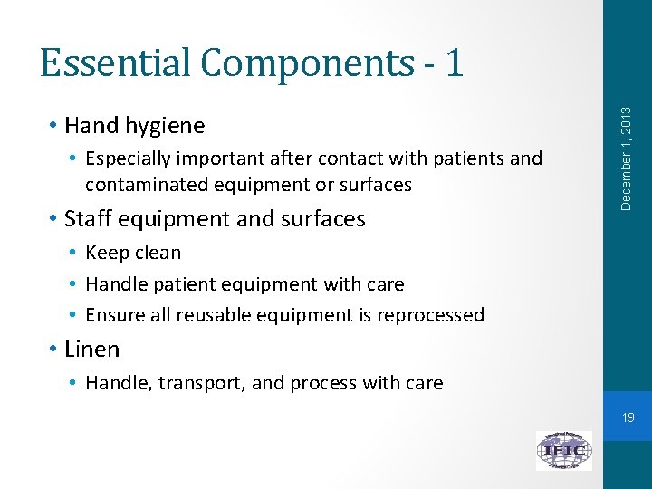 • Hand hygiene • Especially important after contact with patients and contaminated equipment or surfaces • Staff equipment and surfaces December 1, 2013 Essential Components - 1 • Keep clean • Handle patient equipment with care • Ensure all reusable equipment is reprocessed • Linen • Handle, transport, and process with care 19