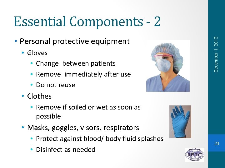 • Personal protective equipment • Gloves • Change between patients • Remove immediately after use • Do not reuse December 1, 2013 Essential Components - 2 • Clothes • Remove if soiled or wet as soon as possible • Masks, goggles, visors, respirators • Protect against blood/ body fluid splashes • Disinfect as needed 20