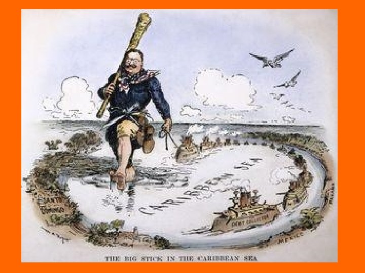 Latin America • Roosevelt Corollary - amendment to Monroe Doctrine - gave U. S. right to intervene if countries could not repay debts or to stabilize the economic affairs - in Caribbean & Central America * Teddy Roosevelt’s “Big Stick” Policy