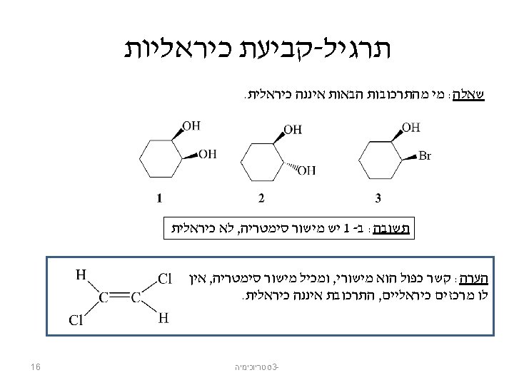 מולקולה כיראלית Lactic Acid: has no plane of symmetry in any conformation and is chiral 15 סטריוכימיה 3 -