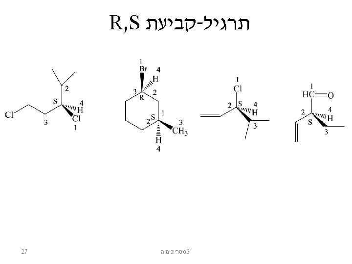 Naming Enantiomers if the lowest priority group is on a horizontal bond, then counterclockwise = R and clockwise = S סטריוכימיה 3© 2014 Pearson Education, Inc. 26