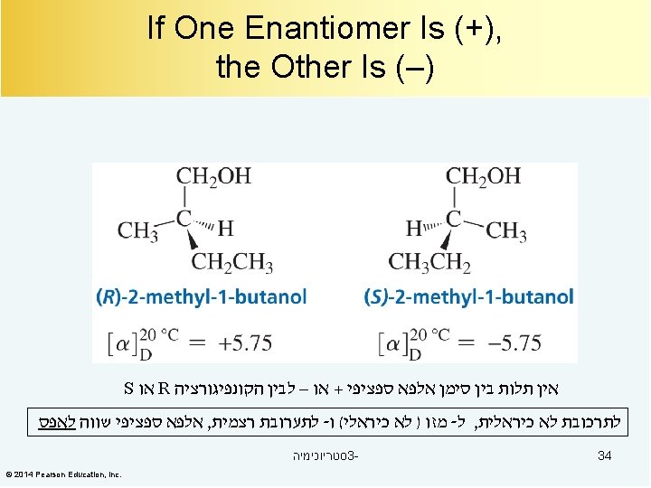 Naming Enantiomers draw an arrow from 1 to 2 to 3 if the lowest priority group is on a hatched wedge, then clockwise = R © 2014 Pearson Education, Inc. and counterclockwise = S סטריוכימיה 3 - 23