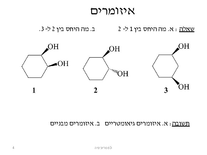 Cis–Trans Isomers Cis–trans isomers result from restricted rotation. Cyclic structures restrict rotation. Cis: The substituents are on the same side of the ring. Trans: The substituents are on opposite sides of the ring. © 2014 Pearson Education, Inc. סטריוכימיה 3 - 3