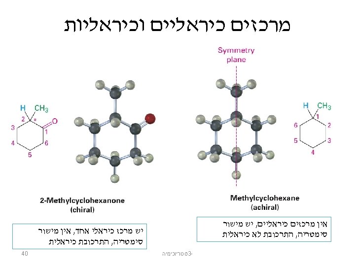 Identifying an Asymmetric Center An asymmetric center is attached to four different groups. two asymmetric centers, four stereoisomers © 2014 Pearson Education, Inc. סטריוכימיה 3 - 39