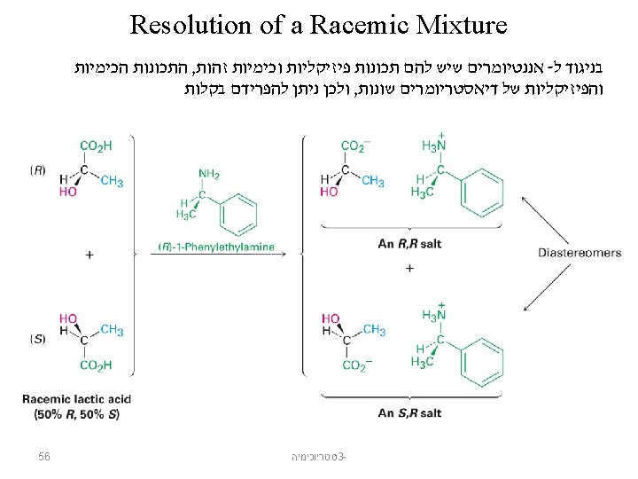 אננטיומרים Chiral From the Greek cheir meaning “hand” Molecules that are not identical to their mirror images, and thus exist in two enantiomeric forms A molecule is not chiral if it has a plane of symmetry Plane of symmetry A plane that cuts through the middle of an object (or molecule) so that one half of the object is a mirror image of the other half A 50: 50 mixture of two chiral compounds that are mirror images– called a racemic mixture 12 סטריוכימיה 3 -