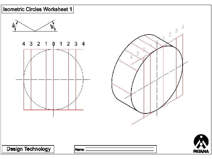 ISOMETRIC CIRCLES AND CYLINDERS CREATING A CYLINDER 6. Having successfully drawn the isometric circle developing it further to change it into a cylinder is relatively easy. Draw 30 degree guidelines out from the isometric circle with your set square as shown in the diagram 7. Measure the distance 30 mm representing the 'thickness' of the cylinder along each 30 degree guideline. Start drawing a curve through each of the points. Your work sheet should look like this: -