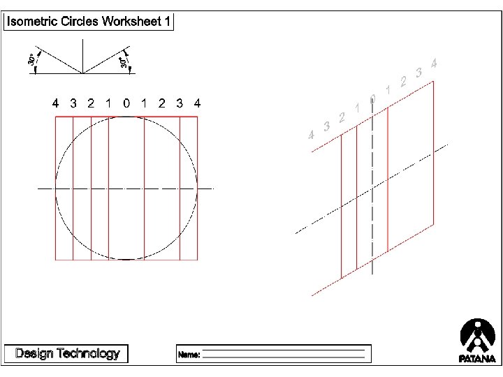 ISOMETRIC CIRCLES AND CYLINDERS 3. Draw the grid in isometric using a 30 degree set square, being careful to use the same measurements as the original grid which surrounds the circle. 4. To draw the circle in isometric projection simply measure each distance down each vertical line on the normal grid and transfer it to the isometric grid. On the diagrams opposite - distance 'x' on guideline 3 has been transferred to the isometric grid. This is repeated for each of the guidelines 1, 2, and 4. Your work sheet should look like this: -