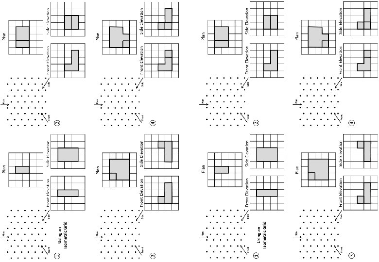 Plan Front Elevation ① Plan Side Elevation Front Elevation ② Using an Isometric Grid Plan Front Elevation ③ Side Elevation Plan Side Elevation Front Elevation ④ Side Elevation