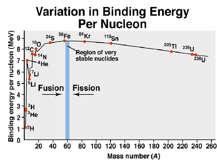Sample Problem 24. 6 Calculating the Binding Energy per Nucleon PROBLEM: Iron-56 is an extremely stable nuclide. Compute the binding energy per nucleon for 56 Fe and compare it with that for 12 C (mass of 56 Fe atom = 55. 934939 amu; mass of 1 H atom = 1. 007825 amu; mass of neutron = 1. 008665 amu). PLAN: Find the mass defect, m; multiply that by the Me. V equivalent and divide by the number of nucleons. SOLUTION: Mass Defect = [(26 x 1. 007825 amu) + (30 x 1. 008665 amu)] - 55. 934939 m = 0. 52846 amu Binding energy = 12 C (0. 52846 amu)(931. 5 Me. V/amu) 56 nucleons = 8. 790 Mev/nucleon has a binding energy of 7. 680 Me. V/nucleon, so 56 Fe is more stable.