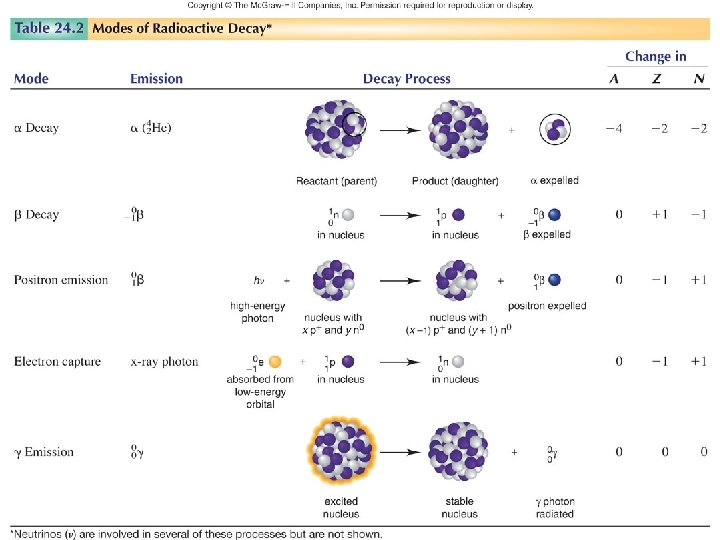 Natural Radioactive Decay Processes Reason for Nuclear Instability Excess Mass N/Z too high N/Z too low Energetically Radioactive Emitted Process Radiation decay 4 Nuclear Change Loss of 2 protons and 2 neutrons occurs 0 - decay -1 A neutron is converted into a proton and an electron. 0 + decay +1 a proton is converted into a neutron and a positron. Electron Neutrino A proton combines with capture an inner-shell electron to become a neutron. emission Gamma ray Loss of excess nuclear energy occurs. 2 Change in N/Z Ratio Slight increase Decrease Increase None